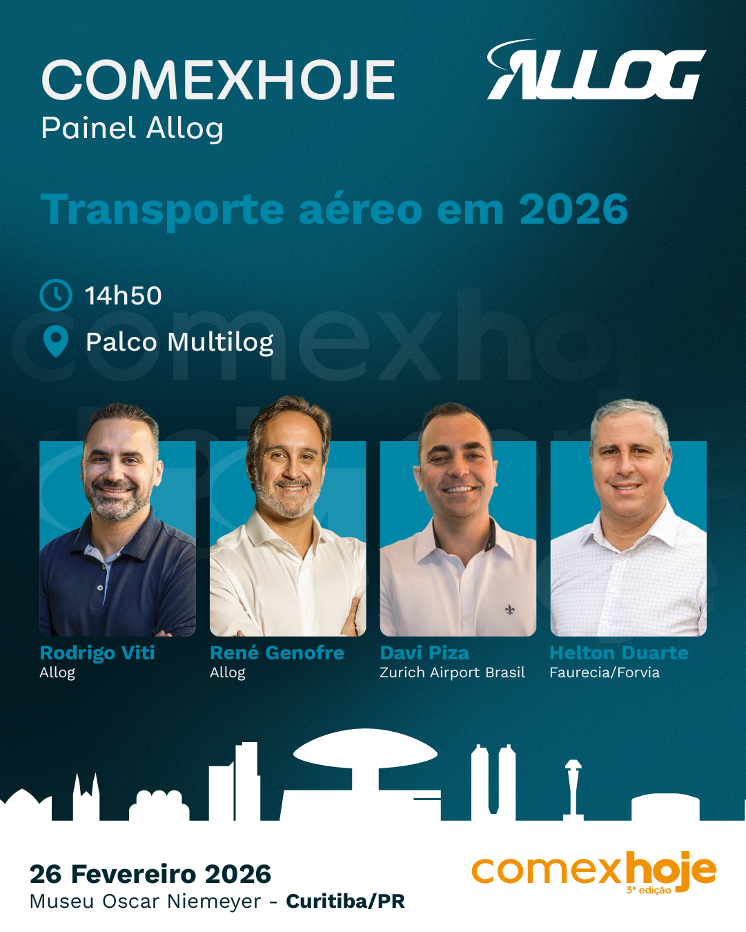 Os principais riscos e oportunidades do transporte aéreo de cargas em 2026 será o foco de um debate liderado pela Allog no Comexhoje, evento reconhecido como um dos principais de logística no Sul do Brasil, que reunirá decisores de grandes indústrias, especialistas e players do setor no próximo dia 26 de fevereiro, no Museu Oscar Niemeyer, em Curitiba (PR).