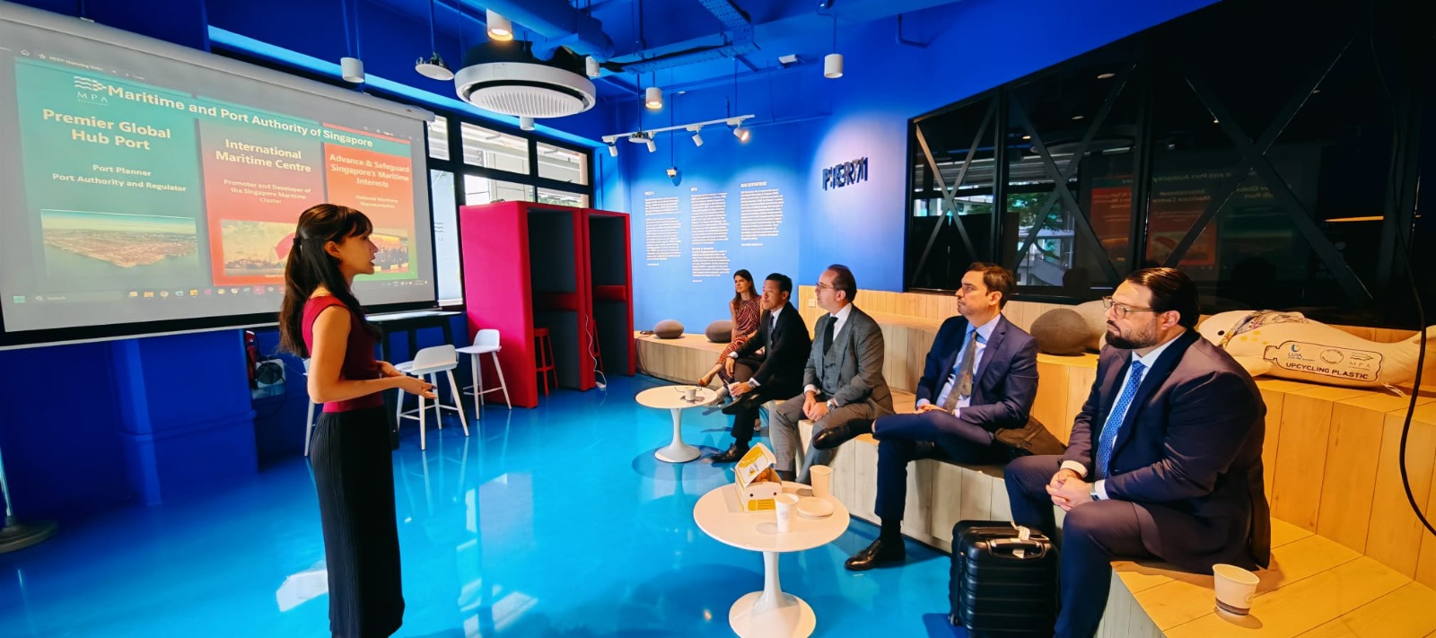 Na sequência, acompanhados pelos representantes da embaixada, a comitiva teve reunião no Pier71, hub de inovação marítima que conecta startups, indústrias, portos e investidores e que atua no desenvolvimento e testes de soluções para digitalização, eficiência operacional, segurança e descarbonização.